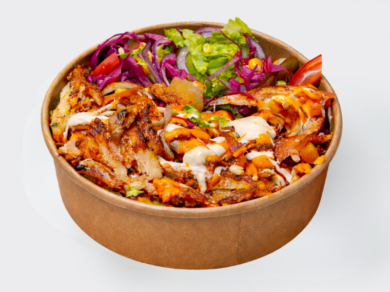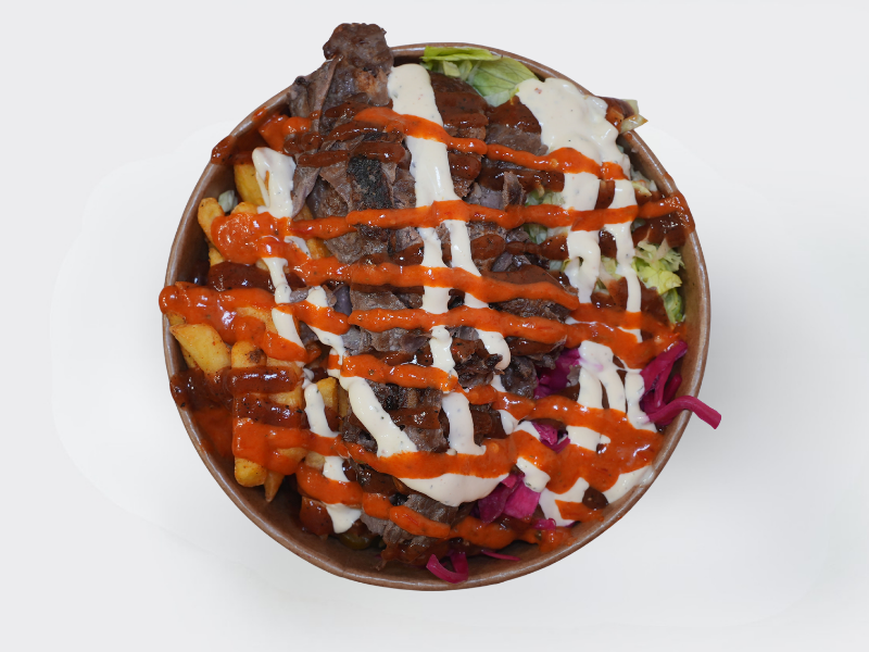 Marine edilmiş tavuk eti, çıtır patates kızartması, atom marul, mor lahana turşusu, kornişon turşu, mor soğan, havuç, domates, özel soslar, jalapeno biber