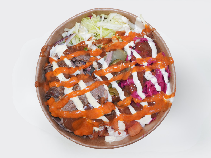 Marine edilmiş dana eti, iceberg, karalahana turşusu, kornişon turşusu, kırmızı soğan, havuç, domates, jalapeño biber ve özel soslar.